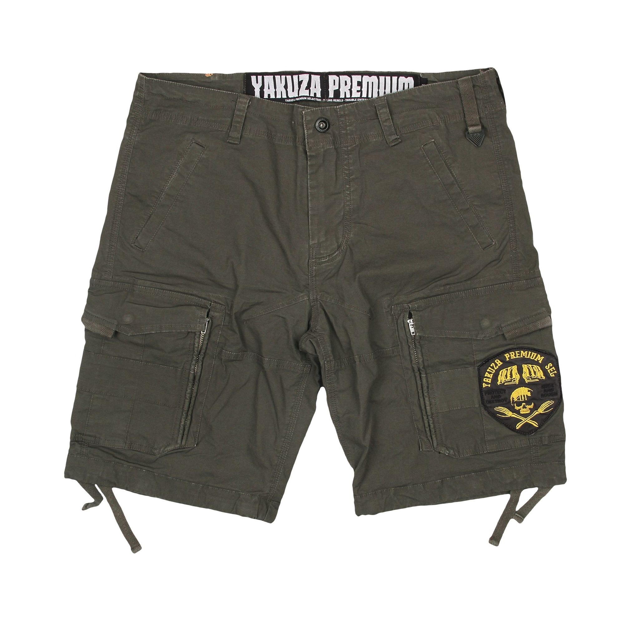 Cargo šortky s efektnými detailmi. Ľavé stehenné vrecko je zvýraznené výraznou kontrastnou nášivkou. Zapínanie je klasicky riešené pomocou zipsu a gombíka. Na vreckách sa nešetrilo, dve vrecká sú tradične na bokoch, dve na stehnách a tie sú navyše doplnené vreckami na zips. Zadná časť je tiež zdobená, s koženkovým štítkom v páse, dvoma zadnými vreckami s klopami a zosilneným sedom.