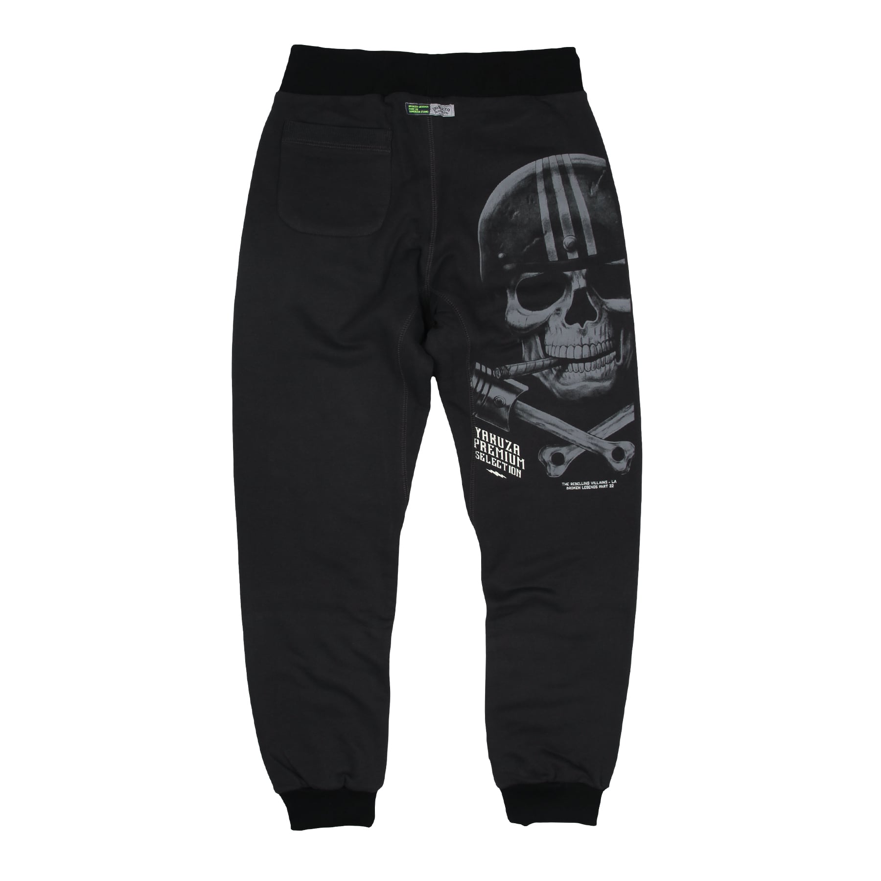 Dobre padnúce tepláky so zúženými nohavicami a obrovskou lebkou na zadnej strane. Dve malé nášivky na prednej strane. Šírku pása upravíte stiahnutím kontrastnej šnúrky, ktorá prechádza cez veľmi elastický náplet. Na spodnej časti nohavíc sú tiež náplety. Vrecká na bokoch a jedno na ľavej zadnej časti. Výrobca opäť zvolil veľmi pohodlný a elastický úplet.